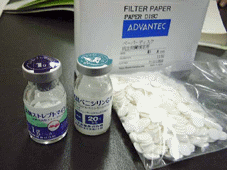 7.抗生物質を滅菌水で所定の濃度に調製する。(今回はペニシリンを使用し、1バイアル当り20万単位のものを、約5万倍に希釈した)