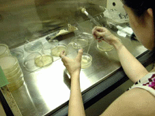6.滅菌済みのコンラージ棒で、懸濁液を 平板培地全面に塗りつける。