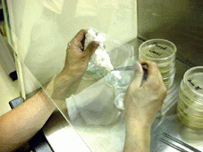 (3)滅菌したガーゼでアンプルを包み、徐々に力を入れて割る。
