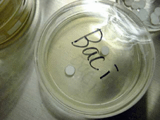 9.滅菌済みのピンセットを用いて、抗生物質をしみ込ませたペーパーディスクを平板培地に置く。