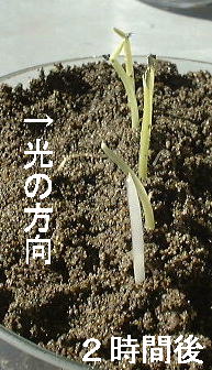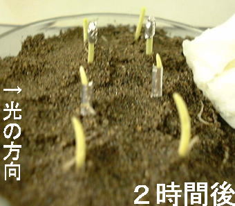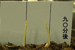 光による屈曲は、比較的簡単で再現性もよくできた。芽生えをそのまま使うので準備にも時間がかからない。その気になれば、演示実験で教室に持ち込むこともできると思う。しかし、2時間近く時間がかかること、蓋を取ってしまってから2時間も経てば元に戻ってしまうことなどを考えると、現物を持って行くには、タイミングを計った準備が必要であろう。