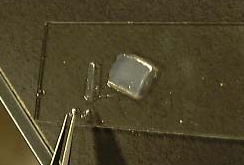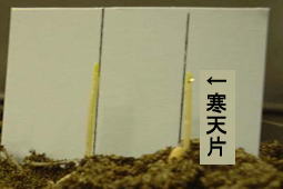 (4)IAA入りの寒天片は、シャーレに蒸留水で溶かした2%寒天の上に、IAAを10の−9乗mol/Lの濃度に薄めて入れた。このまま、しばらくIAAが寒天にしみこむのを待った。この寒天を小さく切りだして作った。