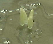 先天を切除し、中の第一葉を基部から引き抜き、子葉鞘だけにした後、1%寒天の薄片を載せ、その上に切除した先端を載せました。